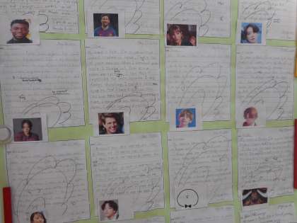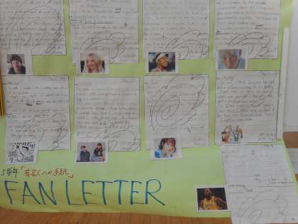 英語科で取り組んだ「ファンレターを送ろう」のプリントが掲示されています。どれも表現の工夫があふれています。