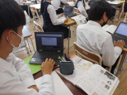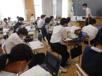3−Cの社会の授業風景です。社会科では、グラフや資料が見やすいように、クロームブックを活用しています。