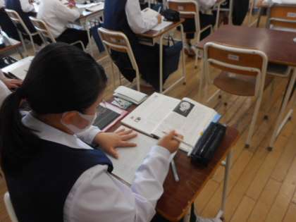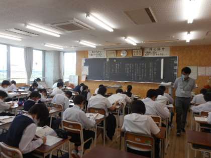 1−Cの国語の授業風景です。説明的文章の学習をしています。「ルビンのつぼ」という絵をもとに、様々な視点から物事をとらえることの必要性を学びました。