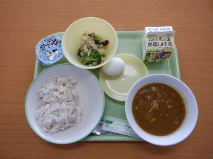 今日の給食 公開日 2022/06/13 更新日 2022/06/13 芝園の一日 6月13日(月) 今日の給食メニューは、 ・カレー(麦ごはん) ・ビーンズサラダ ・牛乳 ・ゆで卵 ・ヨーグルト です。 今日はみんな大好きなカレー。美味しくいただきました。
