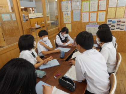 1−Aの学級活動の様子です。1年生は、2年生の授業を参観した後、学級に戻って授業に取り組む姿勢について話し合いました。「先輩たちは、私語がなく授業に集中していた」「授業が始まる前から準備をし着席していた」などの意見が出ました。「芝園プライド」を先輩達から受け継ぐためにも、先輩のよさを学び行動していきましょう。