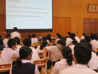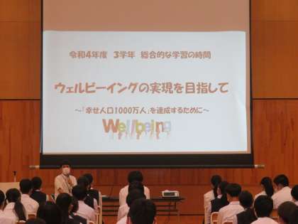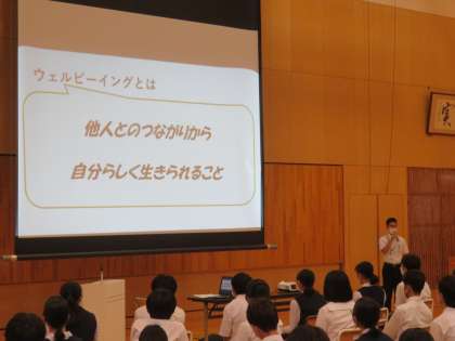 「ウェルビーイング(well-being)の実現を目指して」のテーマについて理解を深めました。WHO憲章やSDGSから内容を捉えたり、周りの人と意見を交わしたりしながら、「幸せ」について考えました。