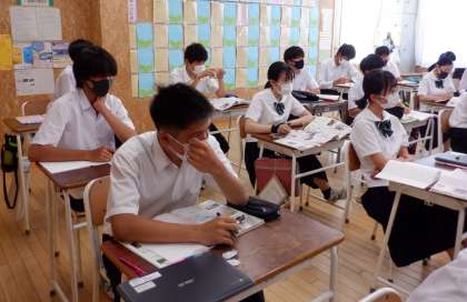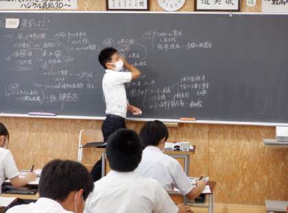 今日は期末考査に向けて、学習内容の復習をしています。先生の質問に、生徒はノートや教科書を見ながら、確認をしています。