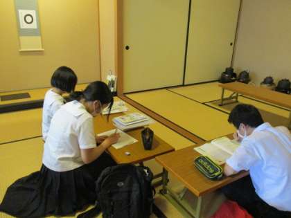 「寺子屋学習会」(茶道部) 公開日 2022/06/23 更新日 2022/06/23 芝園の一日 6月23日(木) 茶道部では、テスト期間に、茶道室を「寺子屋」に見立てて、放課後学習会をしています。静かな環境の中で、集中して学習することができます。