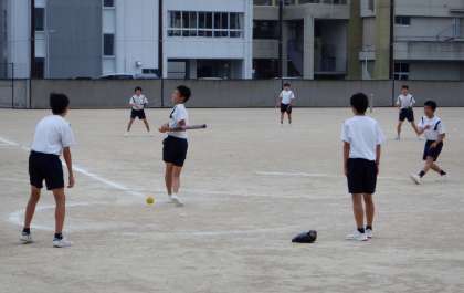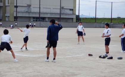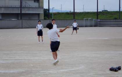 男子はソフトボールをしています。暑さと強風の中ですが、みんなとっても楽しそう。笑顔いっぱいです!
