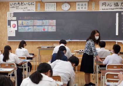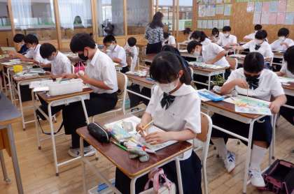 1−Bの美術の授業風景です。自分のお気に入りの物をスケッチし、透明感のある水彩画に仕上げています。みんな集中しています。