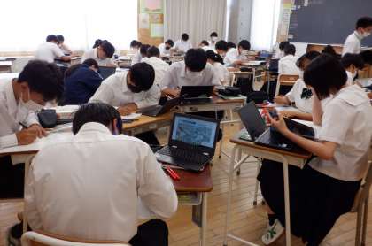 社会では今日から公民分野の学習に入りました。「ウェルビーイング」につながる将来の生き方について考えていきます。生徒は、課題に真剣に取り組んでいます。さすが!3年生!