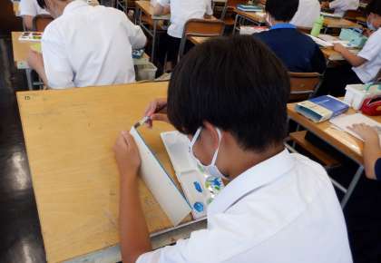 2−Dの美術の授業風景です。黙々とデザインの制作に励んでいます。板の側面まで、丁寧に彩色していますね。