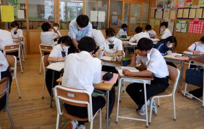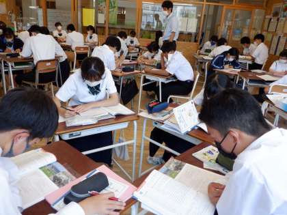 3−Cの英語の授業風景です。教科書の問題について、グループで教え合いながら学習を進めています。分からないことはどんどん聞き合って、理解を進めていきましょう。
