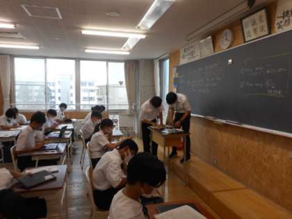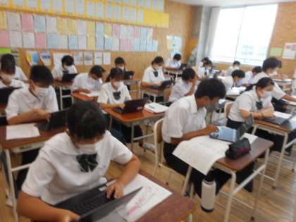 1−Cの英語の授業風景です。1年生の英語では、先週行われた期末考査の問題の解説を聞きました。分からないところは、先生に質問するなど、意欲的に取り組む姿勢が見られました。