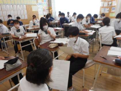 2−Cの英語の授業風景です。「to+動詞の原形」を用いて、ペアになって表現活動をしました。ペアになって聞き合ったり、分からないところは教え合ったりしながら学習しました。