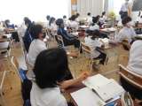 詩の学習 1−A国語 公開日 2022/07/06 更新日 2022/07/07 芝園の一日 7月6日(水) 4限 1−Aの国語の授業風景です。比ゆを用いて作られた詩の内容を、情景を想像しながら読み取りました。詩は言葉の意味から情景を想像しながら読むと楽しいですね。友達のユニークな発想に驚きや笑いがこぼれました。