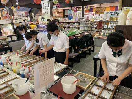 2学年校外学習 10 公開日 2022/07/08 更新日 2022/07/08 芝園の一日 7月8日(金) 紙すき体験では、葉書を作りました。紙すきをした後に、葉っぱを置き、色もつけました。出来上がりが楽しみですね。