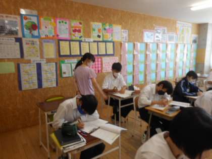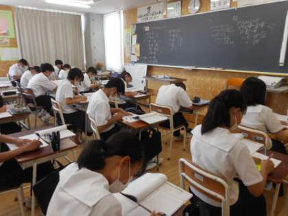 2次方程式の学習 3−C数学 公開日 2022/07/11 更新日 2022/07/11 芝園の一日 7月11日(月) 4限 3−Cの数学の授業風景です。解の公式を用いて、演習問題に取り組んでいます。分からない問題は、進んで質問するなど意欲的に取り組んでいます。