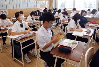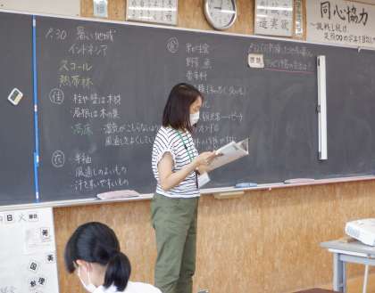 1−Aの社会の授業風景です。「世界の気候と人々の暮らし」について学習をしています。気候が変わると、生活の様子が全く違うことに、生徒は驚いていました。