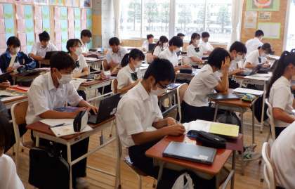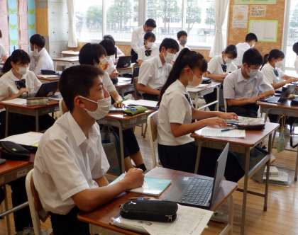 スピーチに向けて 3−C英語 公開日 2022/07/15 更新日 2022/07/15 芝園の一日 7月15日(金) 1限 3−Cの英語の授業風景です。1学期の学校生活を振り返って、頑張ったことを英語でプレゼンします。今日は、その資料作りに頑張っています!