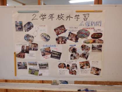 2学年が「校外学習の思い出」というテーマで、壁新聞を作成しました。クラブラウンジ入り口に掲示してありますので、保護者懇談会に来られた際はぜひご覧ください。