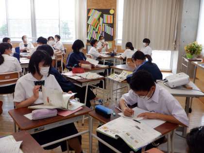 英語クイズ大会をしよう 1−A英語 公開日 2022/07/20 更新日 2022/07/20 芝園の一日 7月20日(水) 1限 1−Aの英語の授業風景です。これまで学習したことを生かして、「英語クイズ大会」の準備をしています。どんな英文で、問題をだすか・・・ 楽しく学んでいます!