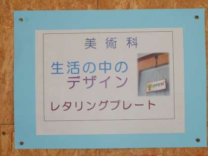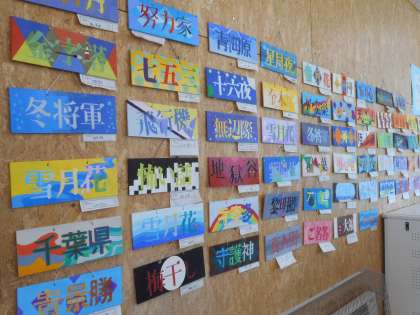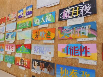 2学年フロアBC間には、デザインボードを掲示しています。生活の中の文字のデザインに着目し、アートな文字に変えたり、色を工夫して仕上げいます。細かなところもこだわりながら楽しんで制作していました。