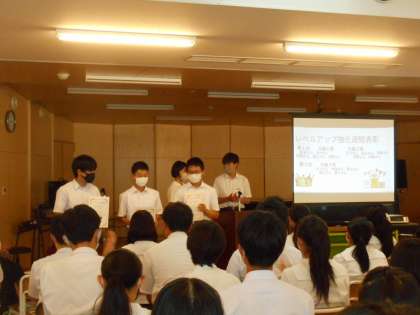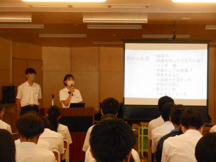 昨日の学年集会の様子です。各クラスで1学期を振り返り話し合った内容をGSSが発表したり、学年代表から話をしたりしました。2学期も行事そして受験に向けて、意識や雰囲気を高めて団結していこうと伝えていました。