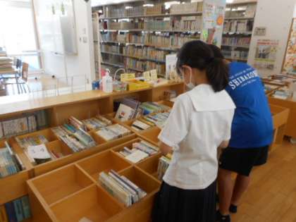 芝園小中学校の図書館の蔵書を、小学校の図書館ボランティアの保護者の方が整理してくださっています。ありがとうございます。