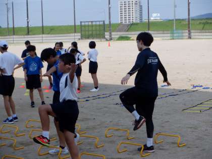 陸上競技部の練習を見ていると、一緒にトレーニングに励んでいる先生の姿が・・・。生徒とともに頑張っています。