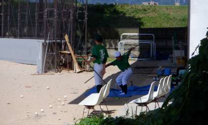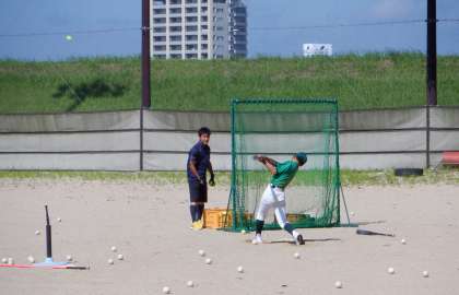 画像は野球部です。バッティングフォームを確認しながら、打撃練習に励んでいます。
