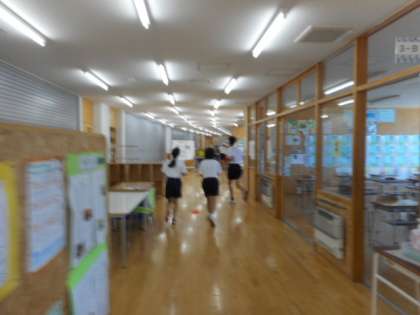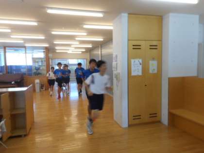 陸上競技部の活動の様子です。環境省から熱中症警戒アラートが発表されたため、校舎内で活動しています。基礎体力を身に付けるためにペース走を行っています。爽やかな挨拶と掛け声をかけ合って活動に取り組んでいました。