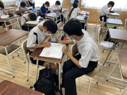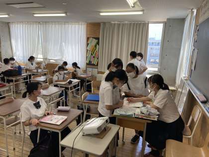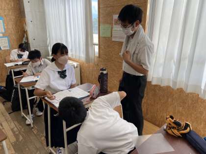 1学年では高校生の先輩方に、勉強をおそわったり、学校生活についての質問をしたりしていました。貴重な機会を逃さないよう、参加者全員が真剣に取り組んでいました。
