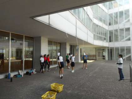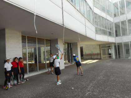 女子ソフトテニス部の活動の様子です。熱中症警戒アラートが出ているため、パサージュで活動しています。コートが使えなくても、工夫して活動しています。