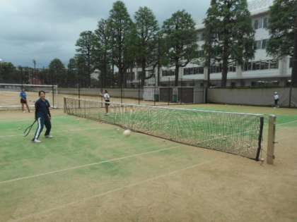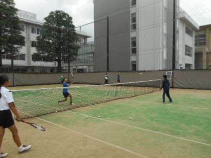 女子ソフトテニス部の活動の様子です。女子ソフトテニス部も明るく元気な声であいさつをします。練習中もつねに掛け声をかけ合って、とてもよい雰囲気で練習に取り組んでいます。