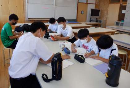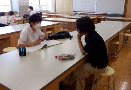 被服室では、1年生が卒業生にいろいろ質問をしていました。和やかな雰囲気です。