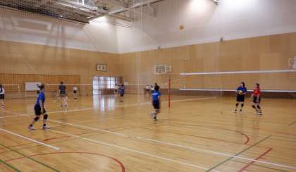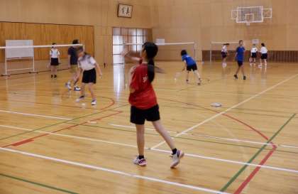 体育館の中では、バレーボール部とバドミントン部が活動をしていました。顧問や外部指導者の方の熱心な始動のもと、声を出して力一杯活動しています。