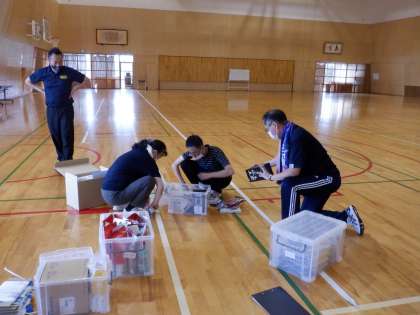 備蓄品を確認し、実際に避難者の受け入れ準備、居住スペース基点やワンタッチパーテーションの設置、特設公衆電話の設置等を行いました。