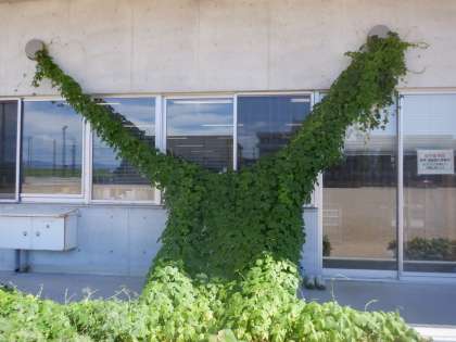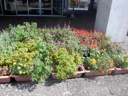 さて、玄関前のプランターや職員室横のグリーンカーテンは、夏の暑さに負けることなく可愛らしい花を咲かせています。可憐な花に,ホッと癒やされますね。