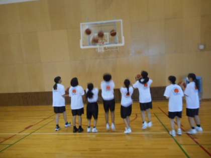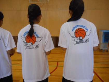 女子バスケットボール部の活動の様子です。おそろいの練習着で練習しています。背中には、女子バスケットボール部のモットーである「NEVER GIVE UP」と「KEEP SMILING」の文字が描かれています。いつも笑顔でプレーする女子バスケットボール部の雰囲気が表れていますね。