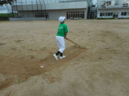 野球部の活動の様子です。練習後にグラウンドを整備しています。環境を整えることを心がけて丁寧に取り組んでいます。