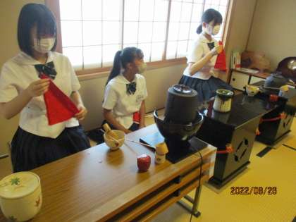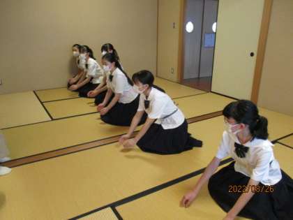 1、2年生は、和室での歩き方や、お運びの練習、3年生は立礼の点前の練習ををしました。「芝園茶会」に向けて稽古をしています。