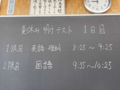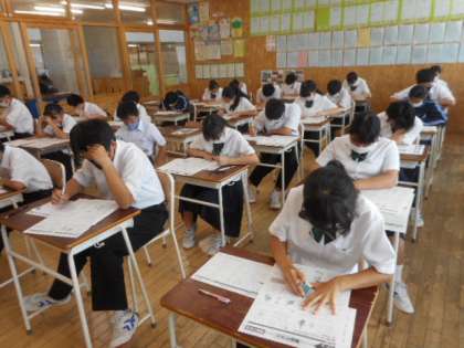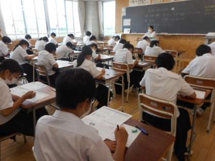 1年生の夏休み明けテストの様子です。主に、夏休み中に取り組んだ課題から出題されます。生徒は、真剣にテストに取り組んでいました。今日から、授業も始まります。新たな気持ちで頑張っていきましょう。