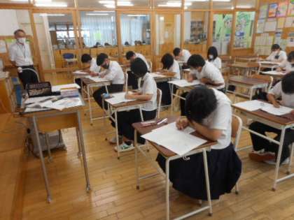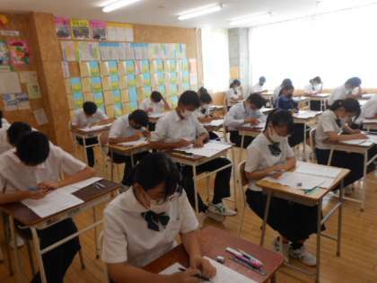 3年生の実力テストの様子です。ほどよい緊張感のなかで、生徒は真剣に取り組んでいました。受験は団体戦とも言われます。みんなで目標に向かって取り組む姿勢がステキですね。