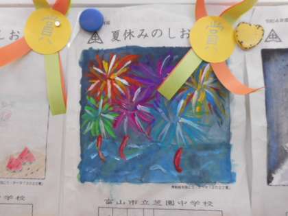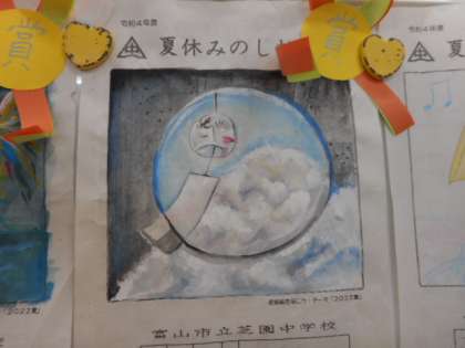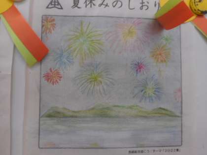 夏休みのしおりの表紙絵のコンテストを行いました。夏らしい情景や、夏休みの思い出を描いた作品が多く見られました。優秀作品を紹介します。