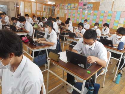 「ウエルビーイングの実現を目指して」のテーマのもと、夏休みに課題追究したことをパワーポイントでまとめています。冊子には、インタビューや、調査活動等を行った、工夫ある追究内容が記されていました。