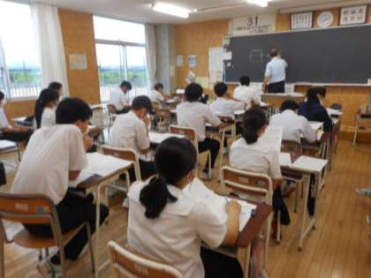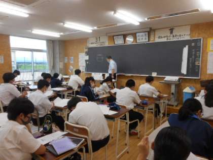 3−Dの理科の授業風景です。校内学力調査の振り返りをしました。間違えやすい問題について解答のポイントを確認しました。次のテストに向けて苦手な分野を克服していきましょう。