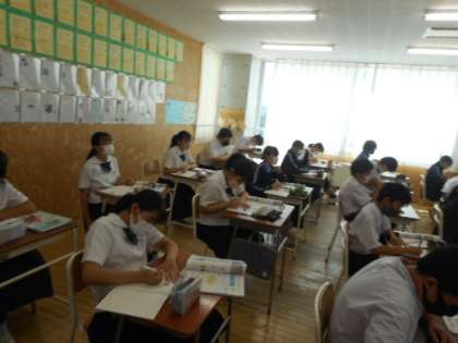 1−Cの英語の授業風景です。今日はリスニングテストに取り組んでいました。英語の会話文を聞いて、問題に答えます。しっかりとメモをとりながら、取り組んでいました。