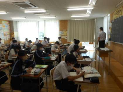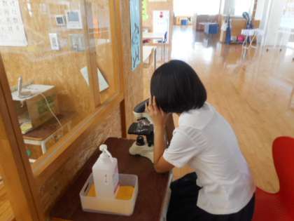 2−Cの理科の授業風景です。顕微鏡で植物の茎の部分の道管や師管を観察しました。植物の体の仕組みや光合成について学習しました。目では見えない世界を観察するのは、ワクワクしますね。