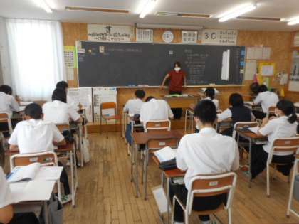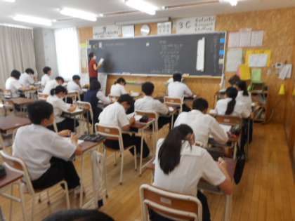 3−Cお数学の授業風景です。2次方程式を使った応用問題に取り組んでいます。これまで学習した内容を基にして、複雑な問題にも挑戦しています。