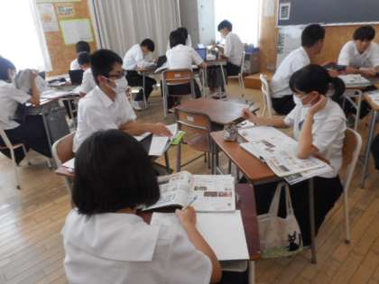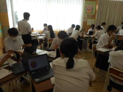 3−Aの社会の授業風景です。国民が主権をもつことの意味について、グループで話し合いをして考えを深めました。クロームブックを活用して、意識調査をしたアンケート結果なども踏まえて考えました。