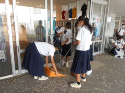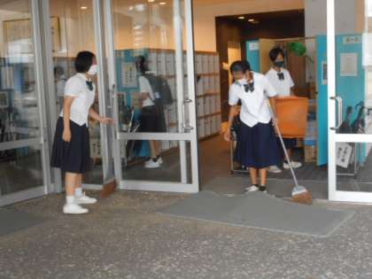 朝の風景から 公開日 2022/09/07 更新日 2022/09/07 芝園の一日 9月7日(水) 昨日の強風の影響で、生徒玄関付近にはグラウンドの砂や落ち葉が吹き込んでいましたが、登校した生徒が、自主的に玄関の清掃をしていました。また風をよけるために校舎内に移動したプランターを協力して運んでいる生徒もいました。進んで奉仕活動を行う姿、ステキですね!