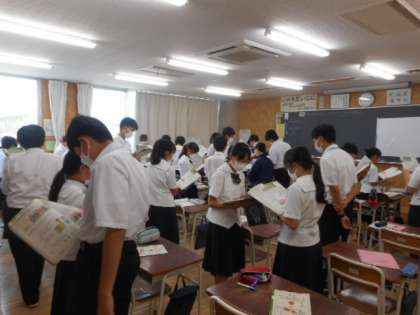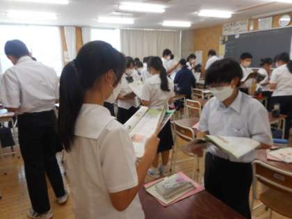 1−Bの英語の授業風景です。ペアになって英語の会話文の練習をしました。どの生徒も積極的に活動に参加していました。声に出して英語で話すことが大切ですね。