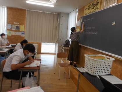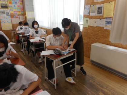 2−Cの英語の授業風景です。AIの長所と短所について書かれた文章を読みました。これまで学習した表現をもとに内容を読み取りました。分からないところは、進んで質問するなど意欲的に取り組んでいます。